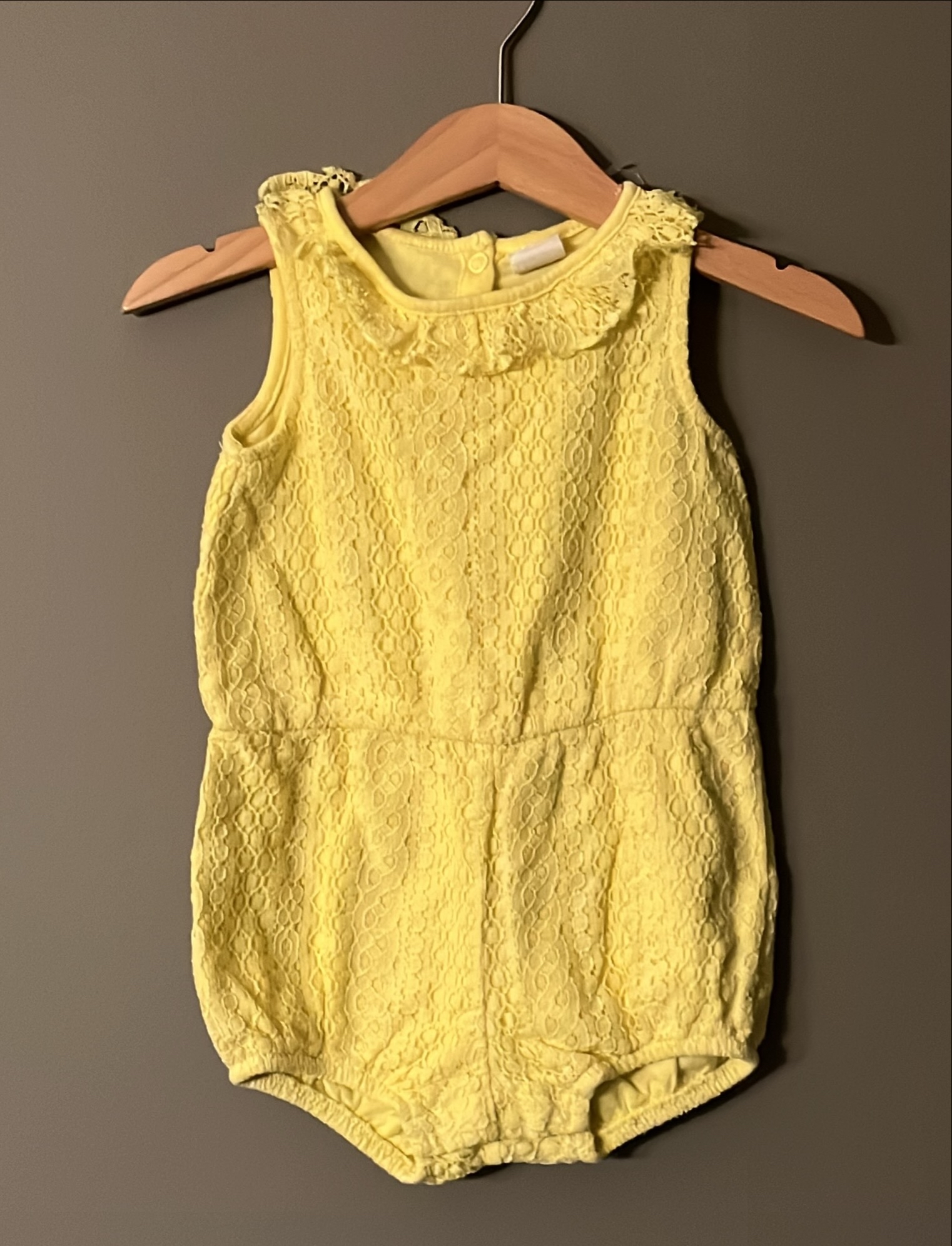 Romper med trykknapper bak nakken og mellom bena. Tolags med blondestoff utenfor.