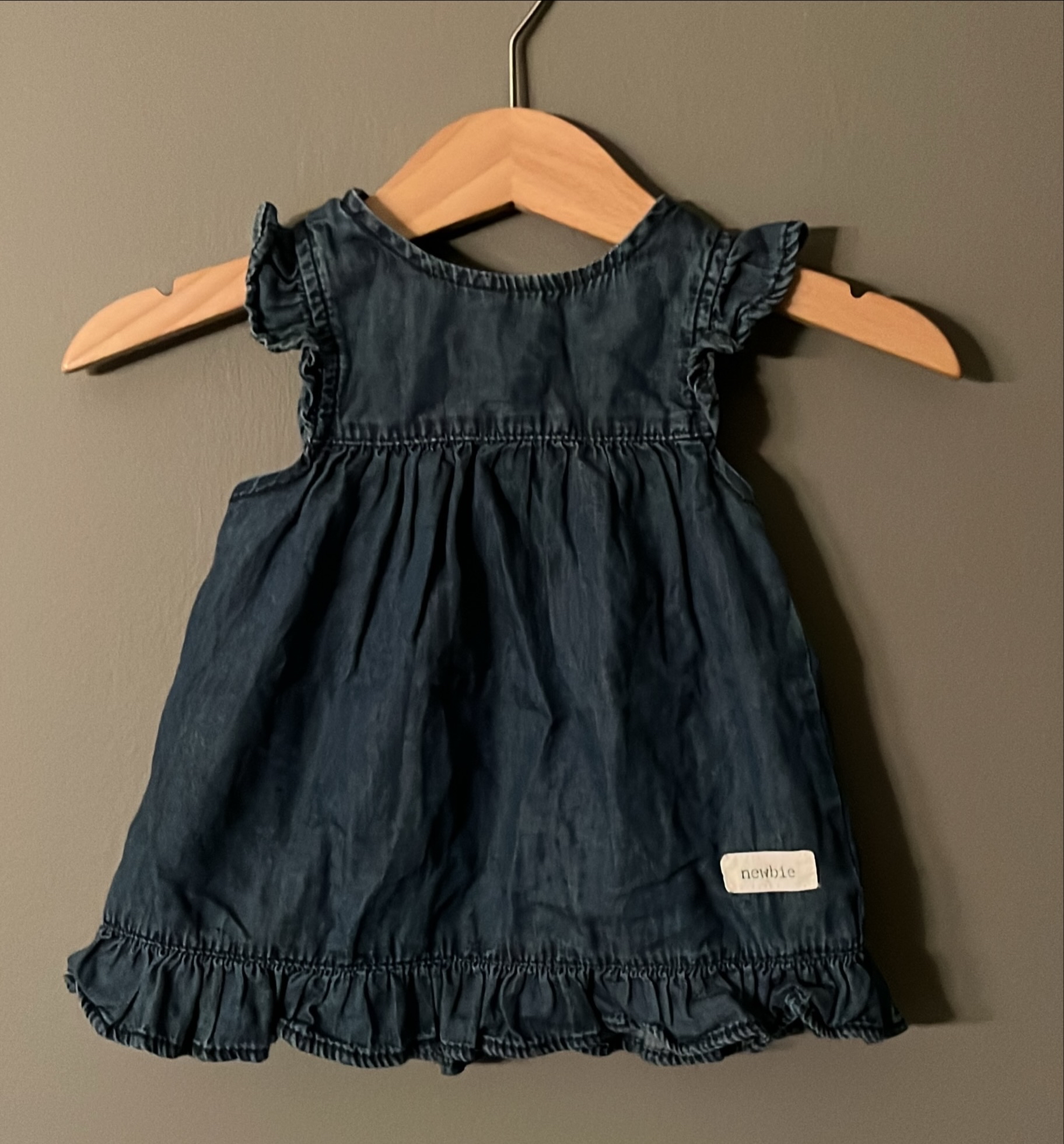 Ubrukt body (prislappen på) med trykknapper langs den ene skulderen. Broderte blomster på ermene.