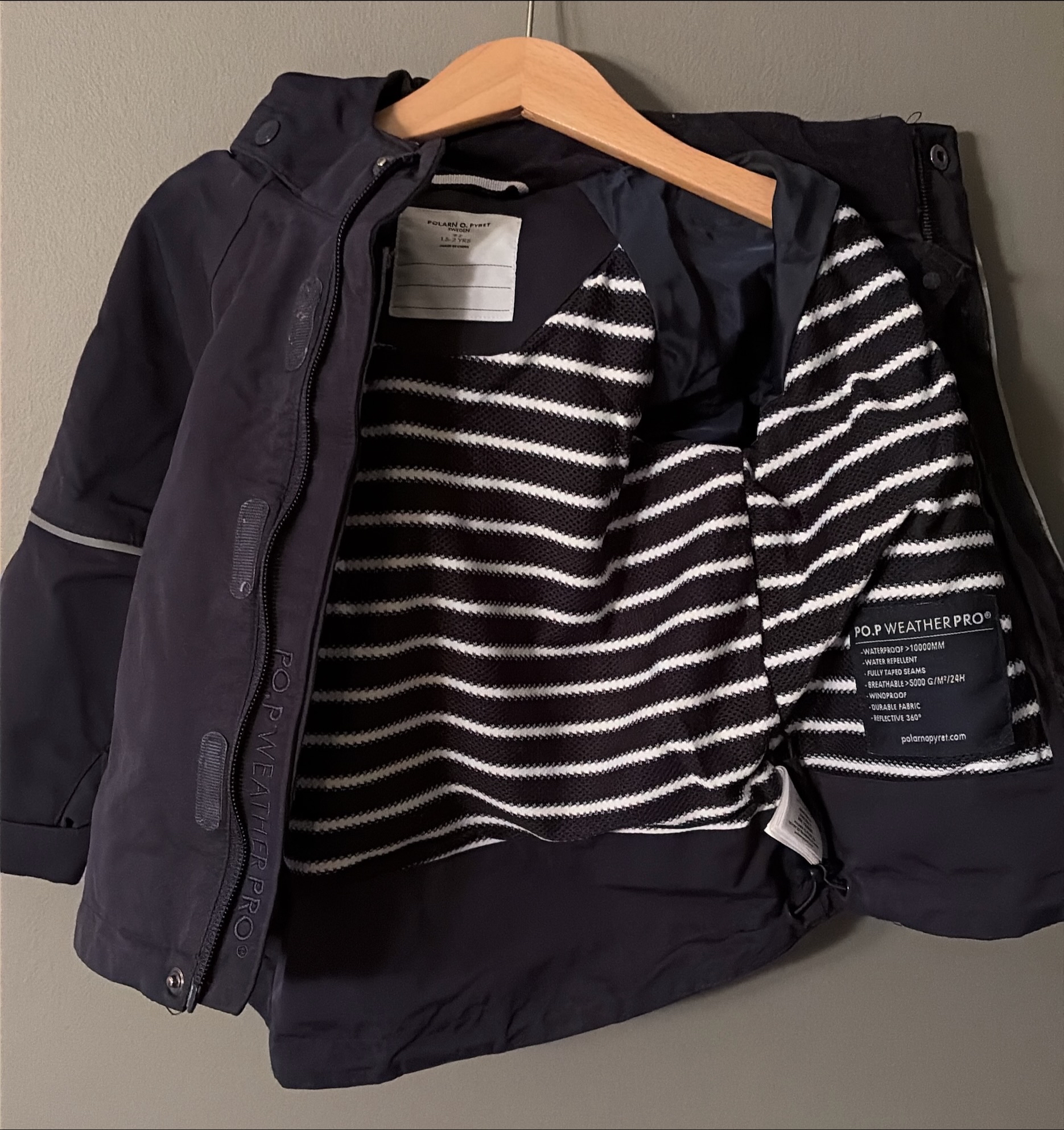Stikkord: 92, jakke, P.O.P, Polarn O. Pyret, skalljakke, vannavvisende, vindtett, yttertøy