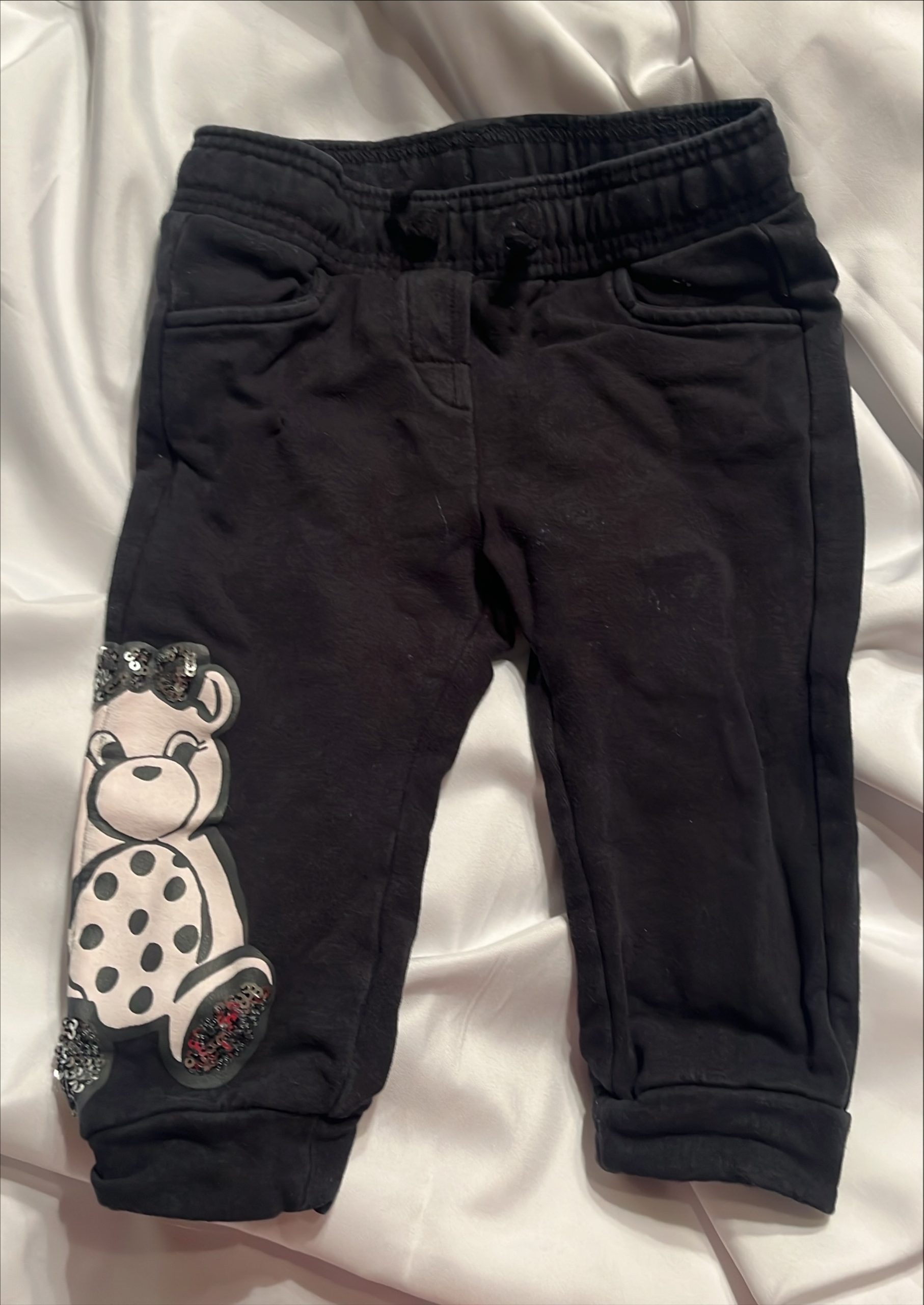 Joggebukse med strikk og snøring i livet. Sidelommer, børstet innside. Print og paljetter på det ene benet